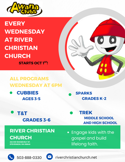 Awana Club is Wednesday night at 6:00 PM at River Christian Church. Club is for children age 3-18.