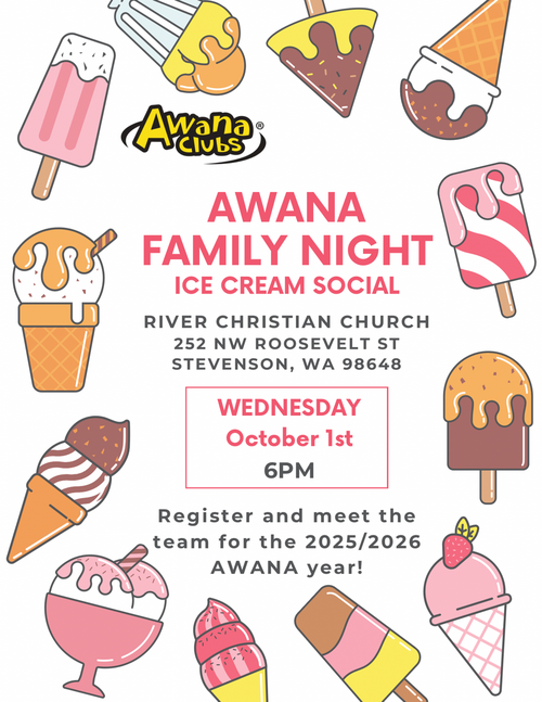 Awana is kicking off on Wednesday, October 1st at 6:00 PM with an ice cream social Family Night! Don't miss this great opportunity to meet the Awana team, register you child for the 2025/26 Awana year, and enjoy some ice cream!